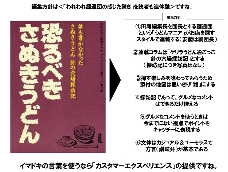 さぬきうどんブームは、書籍「恐るべき讃岐うどん」の存在が最大のKFS(Key Factor for Success)であったと言えます。同書は、30年以上前にコンテンツマーケティングを先取りし、さぬきうどんの魅力を多角的に発信することで、ブームを牽引しました。